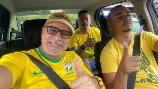 Em uma delas, aparece de camisa do Brasil ao lado do filho Felipe, a caminho de ato em apoio a Jair Bolsonaro no Rio de Janeiro.
