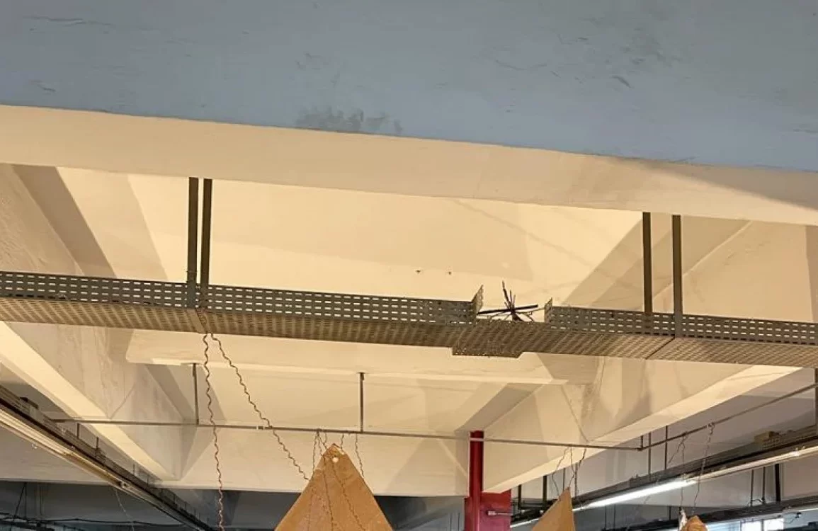 A exposição em cartaz, “Fragmento I: Vento Pórtico”, é a segunda da galeria, aberta no ano passado, e apresenta 32 obras, entre esculturas, instalações, gravuras, vídeos e objetos dos artistas visuais Iah Bahia, Loren Minzú e Siwaju Lima. Eles têm criado in loco, em um ateliê que ocupa um dos andares onde ficava o refeitório e, muitas vezes, utilizando fragmentos da confecção que encontram por lá.