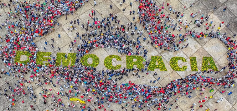Unidos pela democracia! Presidente Lula, ministros e representante das instituições de justiça em foto oficial com o letreiro “Democracia” na Praça dos Três Poderes.