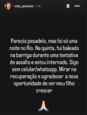 Em sua publicação, Peixoto descreveu o momento como um “pesadelo” e informou que segue internado para recuperação. “Parecia pesadelo, mas foi só uma noite no Rio. Na quinta, fui baleado na barriga durante uma tentativa de assalto e estou internado. Sigo sem celular/whatsapp. Mirar na recuperação e agradecer a nova oportunidade de ver meu filho crescer”, escreveu o assessor.