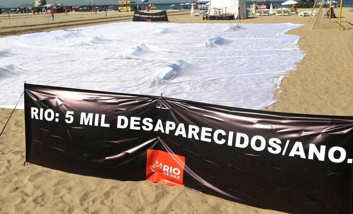 No ato, dez manequins cobertos por um tecido branco foram expostos na areia da Praia de Copacabana, cartão-postal da cidade do Rio. Os manequins lembram os dez anos sem reposta pelo desaparecimento de Amarildo e também o número de desaparecidos por semana em todo o estado.