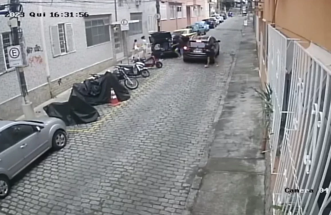 Uma câmera de segurança flagrou o momento em que criminosos armados assaltaram uma mulher e tentaram sequestrá-la na Rua Vitório da Costa, no bairro do Humaitá, Zona Sul, na tarde desta quinta-feira (26). Nas imagens, é possível ver que a vítima estaciona o carro próximo à calçada da rua às 16h30, desce do veículo, abre o porta-malas e busca algumas malas com uma segunda mulher na casa da frente.