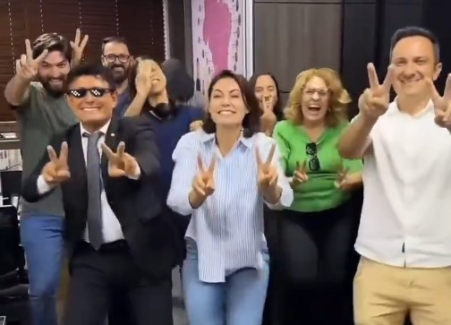 Ao lado de Michelle e outros apoiadores, o deputado federal fez uma coreografia pra lá de sem noção ao som de sua música de campanha. O registro foi feito durante uma reunião com representantes do PL em Brasília e compartilhado pelo parlamentar em suas redes socias.