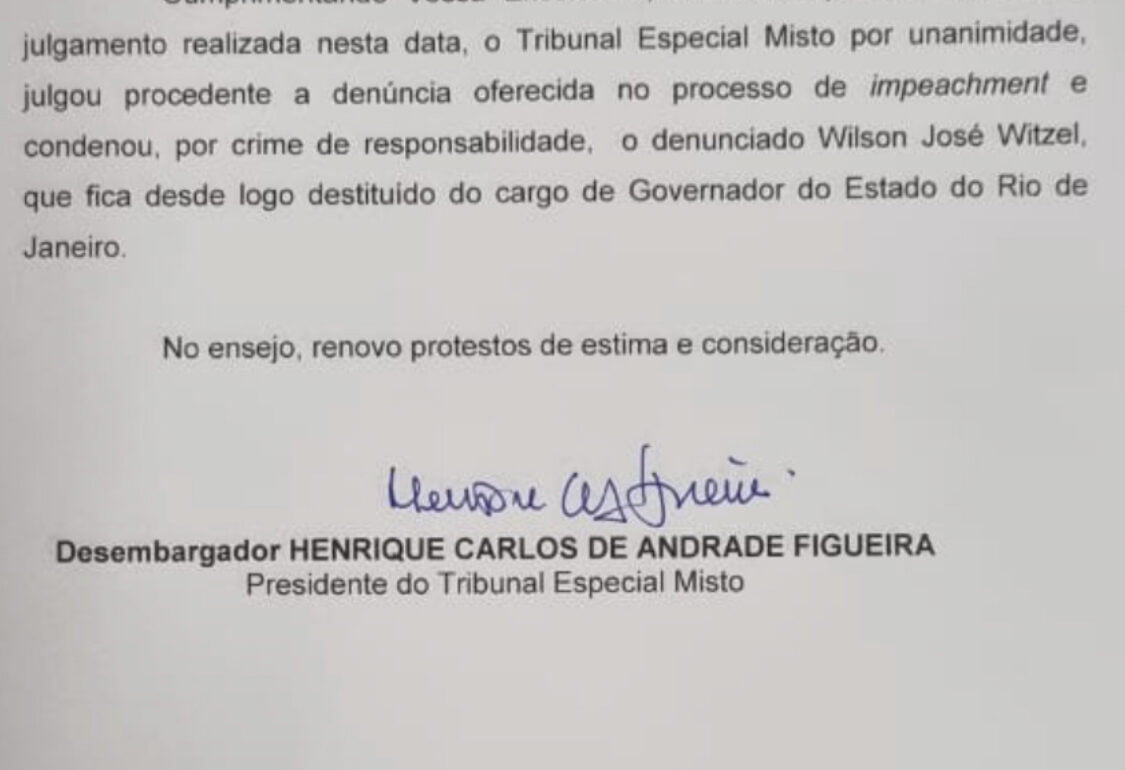 Há poucos minutos, o presidente do TJ, desembargador Henrique Carlos de Andrade Figueira, enviou documento ao Palácio Guanabara, notificando Cláudio Castro sobre a formalização do impeachment de Wilson Witzel pelo Tribunal Misto.