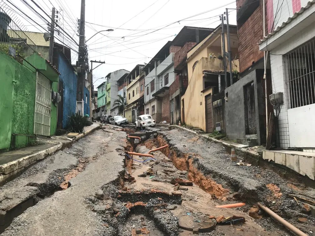 Uma cratera se abriu no meio de uma rua no bairro Morro São Jorge, em Macaé, no Norte Fluminense, após a chuva intensa que atingiu a cidade segunda-feira (19). A rua foi dividida ao meio e alguns carros ficaram pendurados na beira da cratera.
