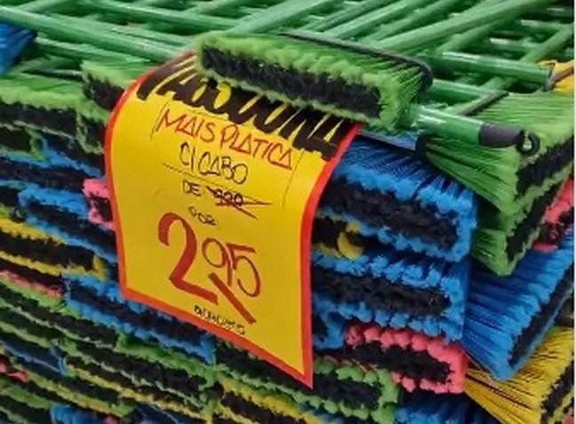Em vídeos compartilhados na rede social da loja, as vassouras são anunciadas a R$ 2,95, enquanto uma panela de pressão de 4,5 litros, que sairia por R$ 69,99, pode ser comprada a R$ 9,95.