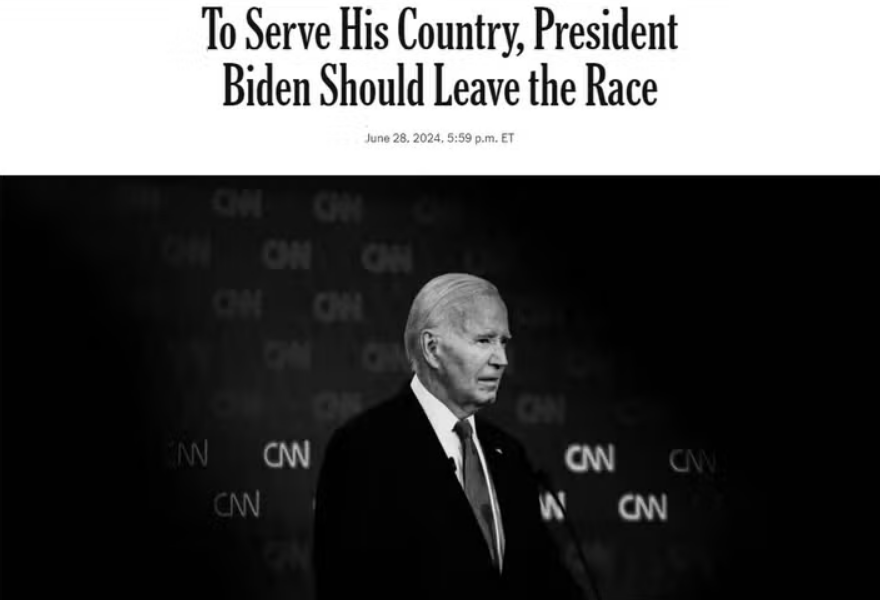 O texto falou das dificuldades de Biden no debate na noite anterior e destacou que a idade e fragilidade do presidente são preocupantes, defendendo a ideia de que ele deveria retirar sua candidatura à reeleição para permitir que um novo candidato democrata “mais capaz” concorra. “A verdade que Biden precisa confrontar agora é que ele falhou em seu próprio teste”, escreveu o jornal americano. “Esta é a melhor chance de proteger a alma da nação — a causa que levou Biden a concorrer à Presidência em 2019 — da nefasta distorção de Trump. E é o melhor serviço que Biden pode prestar a um país que ele serviu de forma nobre por tanto tempo”, conclui o Times.