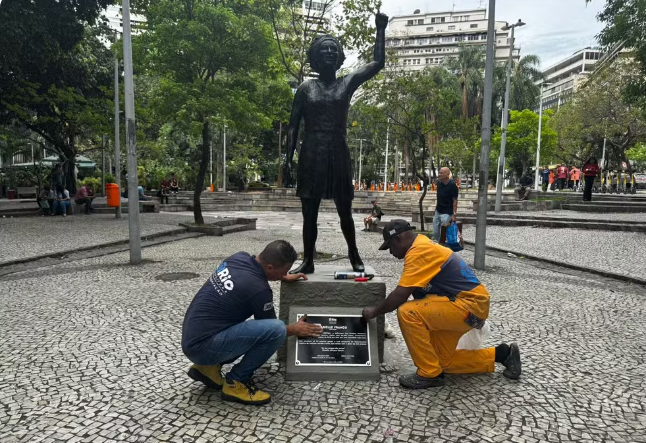 A placa de identificação da estátua de Marielle Franco, vereadora assassinada em março de 2018, foi reinstalada nessa sexta-feira (25) pela Secretaria Municipal de Conservação. A peça original foi furtada em setembro deste ano, no Centro do Rio.
