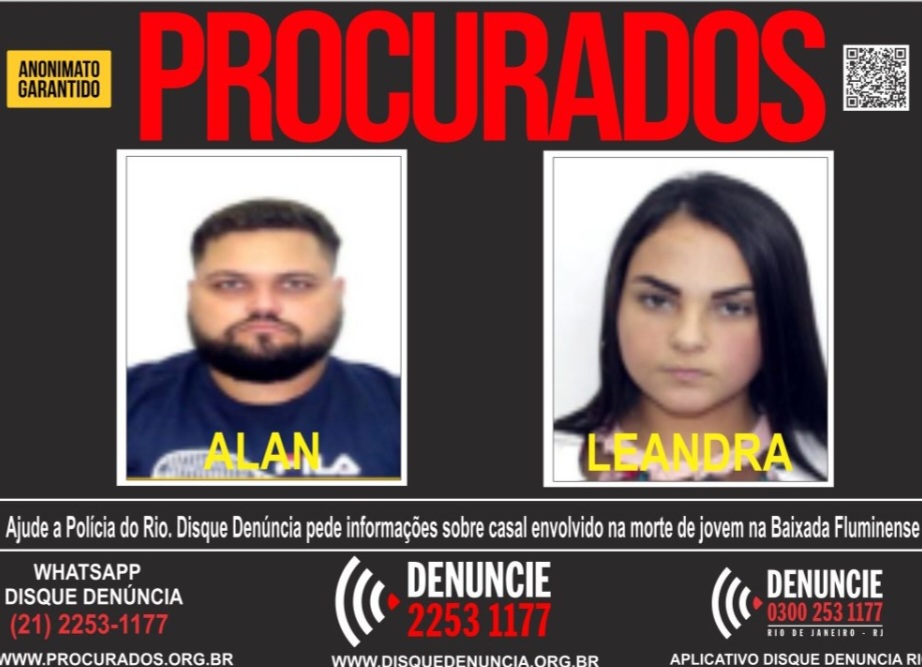 O Disque Denúncia começou a divulgar neste domingo (26(, cartaz com as fotos de Alan Santos Gusmão Júnior, de 26 anos, e de Leandra Victoria de Souza Fortunato, de 22, procurados pela polícia como principais suspeitos do assassinato de Larissa dos Santos Silva, de 26 anos.