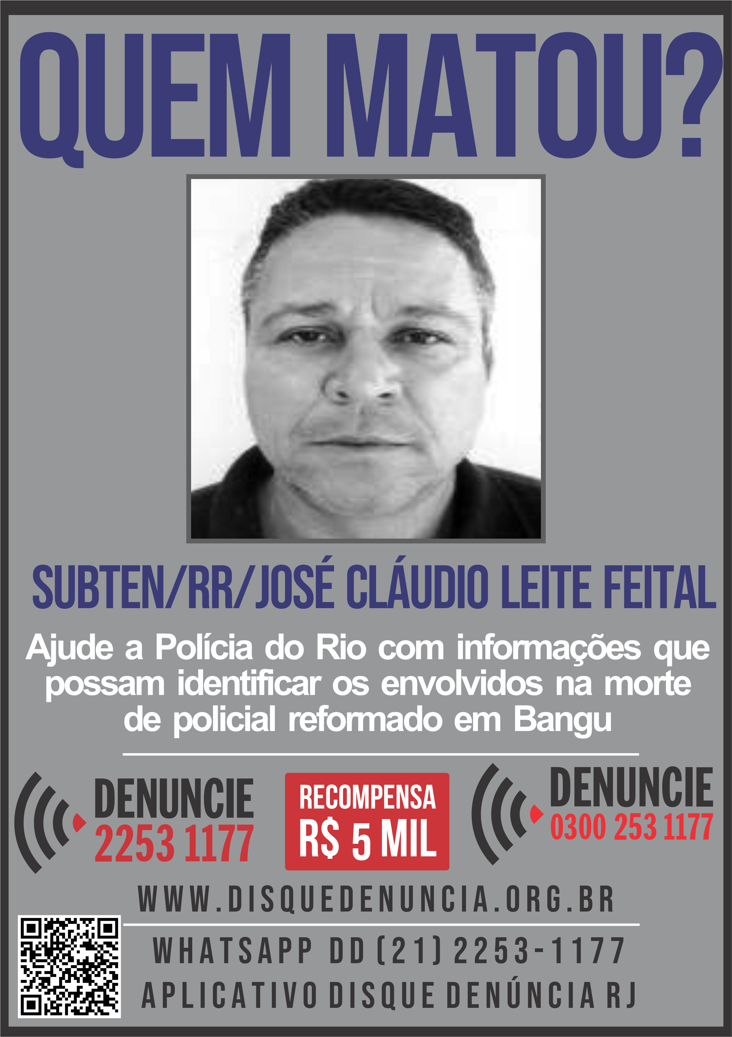 O Disque Denúncia divulgou, neste domingo (20), um cartaz com o título – Quem Matou? – para auxiliar a Delegacia de Homicídios da Capital (DHC) sobre a identificação e prisão dos envolvidos na morte do subtenente reformado da PM José Cláudio Leite Feital, 53 anos, executado a tiros na sexta-feira (18) em Bangu, Zona Oeste do Rio.
