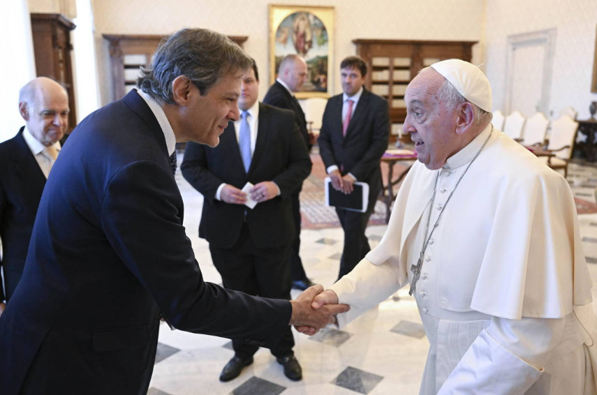 O ministro da Fazenda, Fernando Haddad, foi recebido nesta quinta-feira (6) pelo Papa Francisco no Vaticano, em um encontro privado que ocorreu às 8h, horário local. Durante aproximadamente 25 minutos, Haddad apresentou ao pontífice a proposta brasileira de criação de um imposto global sobre grandes fortunas, uma iniciativa introduzida em fevereiro no âmbito da presidência rotativa do G20.
