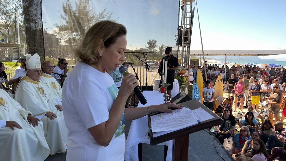 Dez pranchas de surfe foram fincadas nas laterais do palco, montado para a missa celebrada por dom Roberto Lopes, bispo da Causa dos Santos. Os fiéis, a maioria jovem, acompanharam a celebração sentados em cangas e cadeiras de praia.