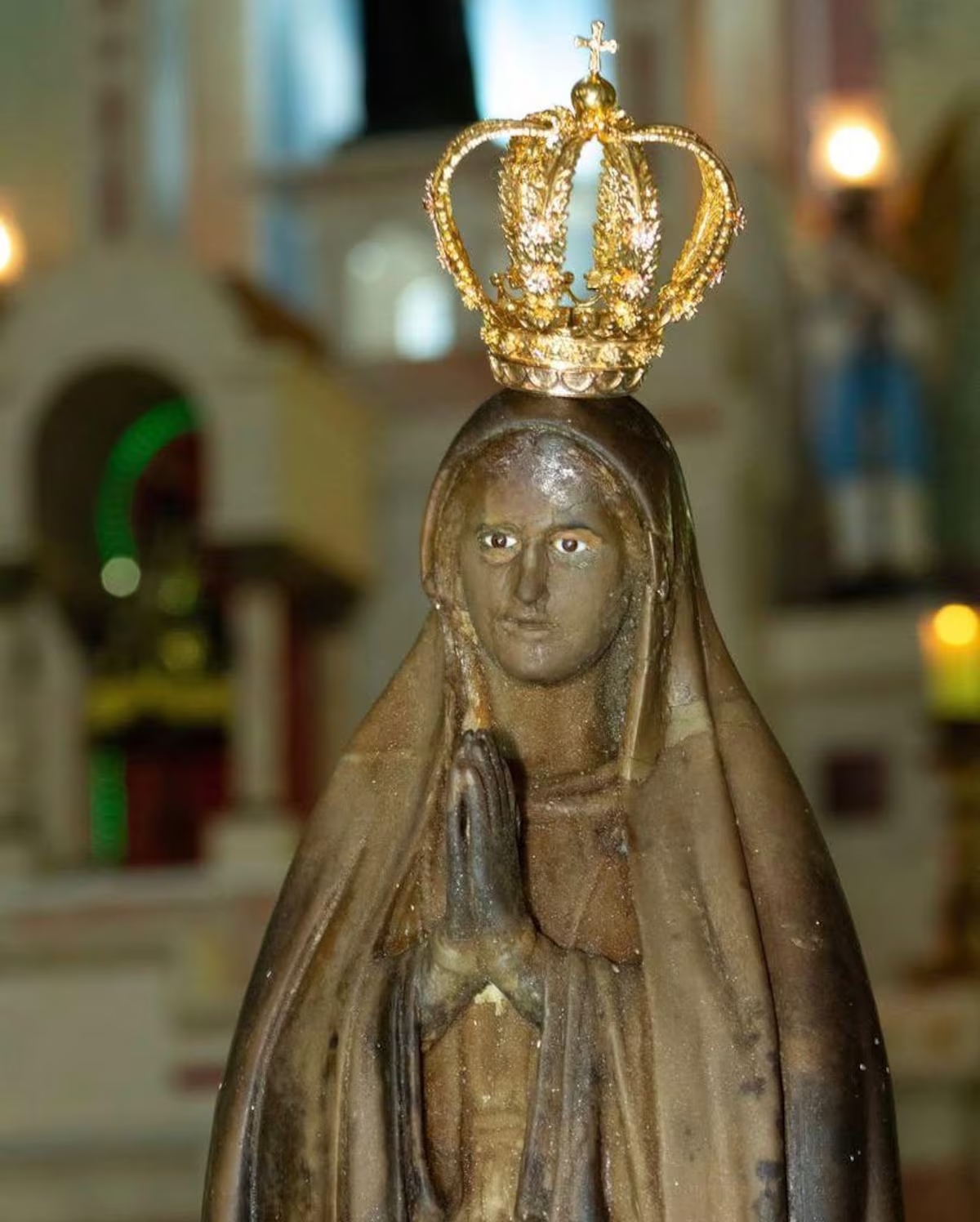 A imagem representa Nossa Senhora de Fátima, cuja devoção se originou das aparições marianas a três crianças em Portugal, entre maio e outubro de 1917. A celebração oficial da santa ocorre em 13 de maio.