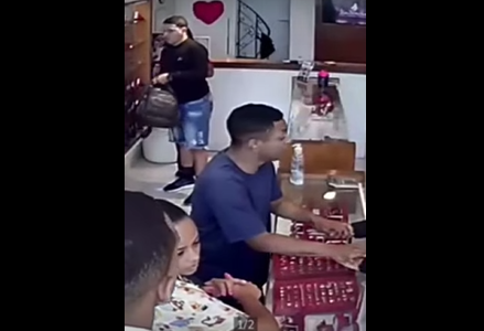 Pelas imagens, é possível perceber que uma funcionária passa mal. Um dos suspeitos dá a volta no balcão e pega uma cadeira para mulher sentar.