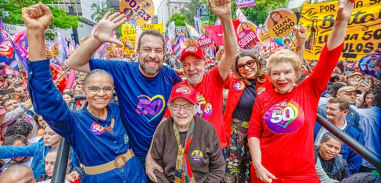 No carro principal, Boulos e a candidata a vice-prefeita Marta Suplicy (PT) desfilaram ao lado do presidente Luiz Inácio Lula da Silva (PT), da primeira-dama Janja, da ministra do Meio Ambiente, Marina Silva (Rede), e da deputada federal Luiza Erundina (Psol), a primeira a aparecer na rua e cumprimentar os eleitores antes do início da caminhada.