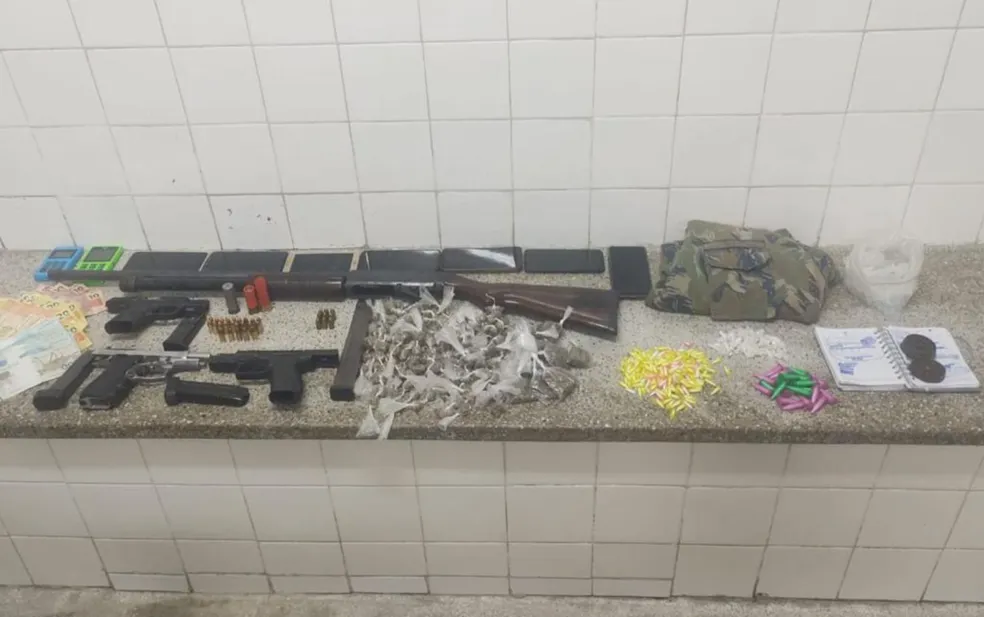 Com eles, foram apreendidos uma espingarda calibre 12, três pistolas de calibres diversos, sendo duas com numeração raspada, munições de calibre 12, 9mm e 380, carregadores para armas de fogo, 262 pinos de cocaína, 196 porções de maconha, 38 pedras de crack, sete aparelhos celulares, duas máquinas de cartão bancário, um caderno de anotações, uma blusa camuflada, embalagens para o acondicionamento e comercialização de drogas, além de RS 4.063,20.