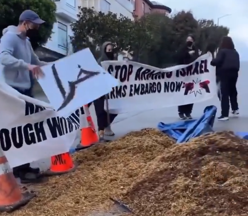 Em frente à casa de Pelosi, manifestantes ergueram seus cartazes sobre a pilha de estrume e gritaram palavras de ordem. Assim como o presidente Joe Biden, Nancy Pelosi é vista como uma firme apoiadora de Israel, tendo feito repetidas visitas ao país.