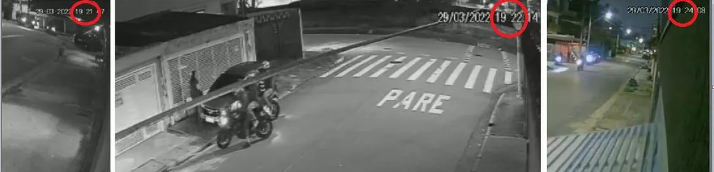 Imagens gravadas por câmeras de seguranças de imóveis do bairro mostram ao menos cinco criminosos em três motos percorrendo ruas do bairro e assaltando três pessoas na Avenida Bom Pastor e na Rua Luis Murat.