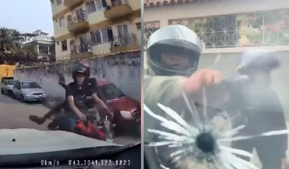 Nas imagens, é possível ver um dos assaltantes atirando à queima-roupa contra o veículo da vítima. Apesar do impacto, que deixou o vidro trincado, ninguém ficou ferido. Após o disparo, os criminosos fugiram rapidamente, com o atirador subindo na garupa da moto, conduzida por seu comparsa. Ambos estavam usando capacetes.