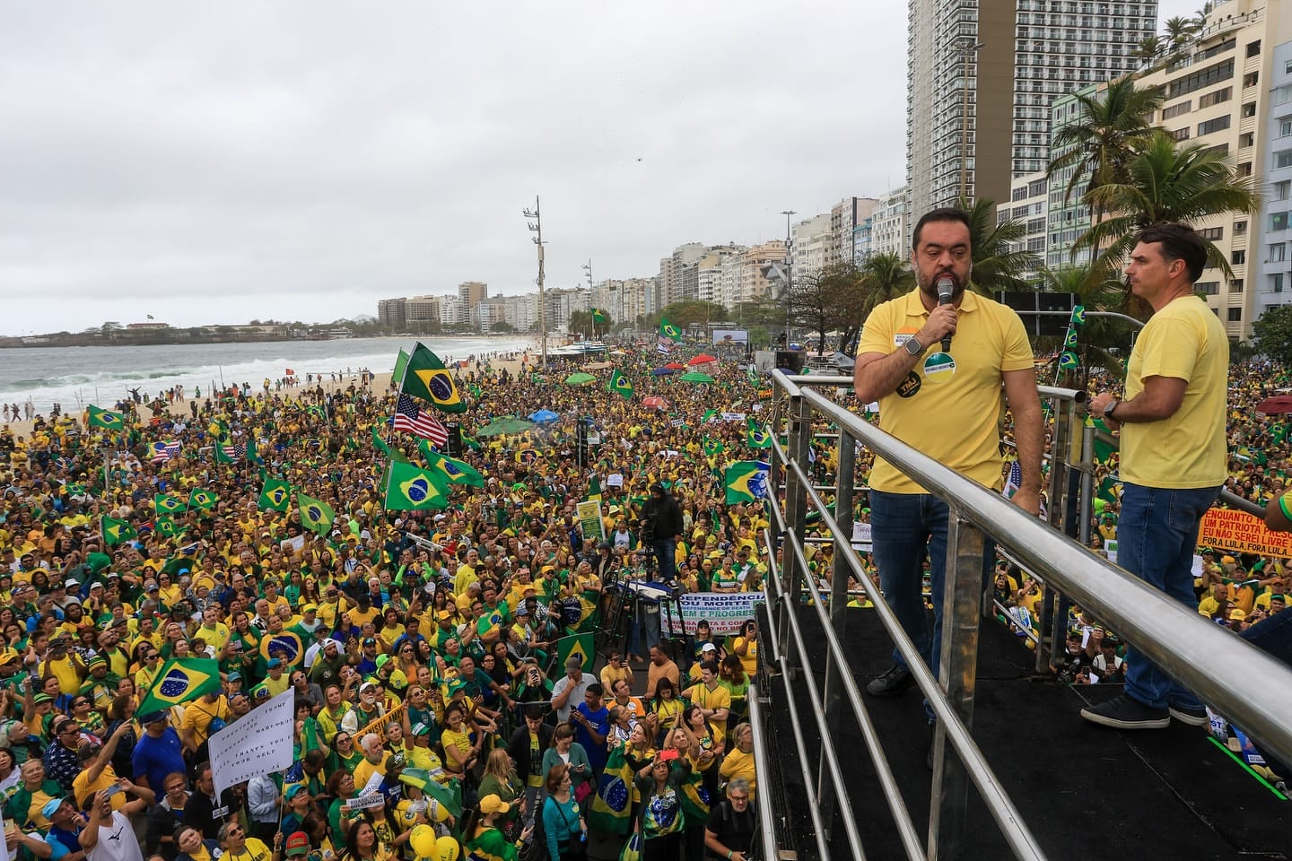 O governador do Rio de Janeiro, Cláudio Castro (PL), discursou neste domingo (7) durante manifestação em apoio ao ex-presidente Jair Bolsonaro na orla de Copacabana, na zona sul da capital fluminense. O ato, convocado por lideranças bolsonaristas, reuniu milhares de pessoas com bandeiras do Brasil e dos Estados Unidos, cartazes de apoio a Donald Trump e mensagens pedindo anistia aos condenados pelos ataques ao Congresso no 8 de janeiro.