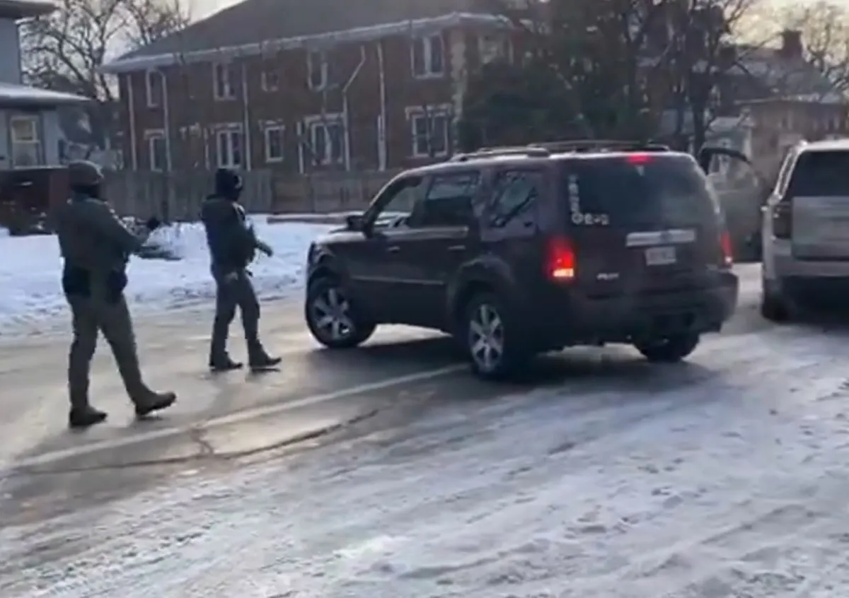 Após as ordens, a esposa de Renee grita: “Dirige, amor. Dirige, dirige”. As imagens mostram o carro desviando dos agentes e se aproximando daquele que filmava. No mesmo momento, ouvem-se os disparos. O veículo acelera, Renee é atingida e acaba colidindo contra um poste logo adiante.