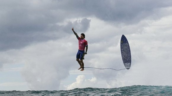 Logo após derrotar o japonês Kanoa Igarashi e avançar na disputa por uma medalha, o surfista brasileiro Gabriel Medina foi fotografado “voando” sobre as águas ao lado de sua prancha. A imagem feita pelo fotógrafo francês Jerome Brouillet viralizou e rodou o mundo.