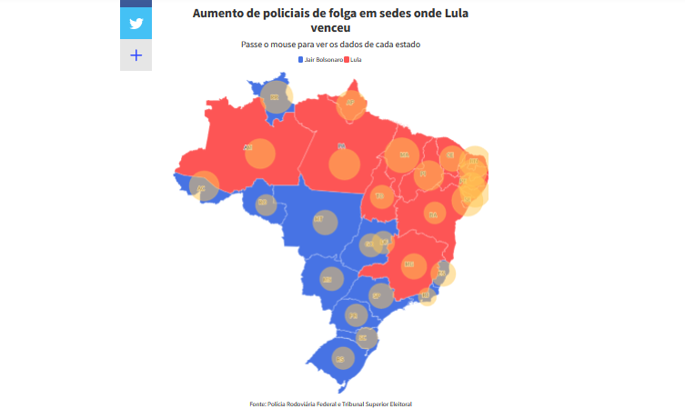 A Polícia Rodoviária Federal escalou mais agentes de folga para trabalhar nas blitze no segundo turno das eleições de 2022 em estados onde Lula (PT) havia ganhado de Jair Bolsonaro (PL) no primeiro turno.