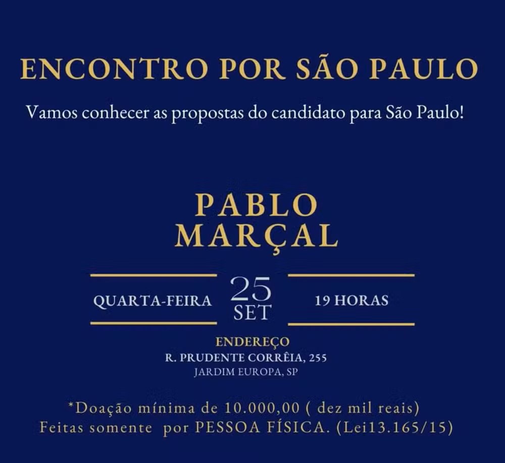 A presença precisa ser confirmada até o dia 22, com comprovante de depósito enviado a um número de WhatsApp pertencente ao advogado Marcelo Tostes, principal doador da campanha de Marçal até agora. Ele contribuiu com R$ 250 mil.