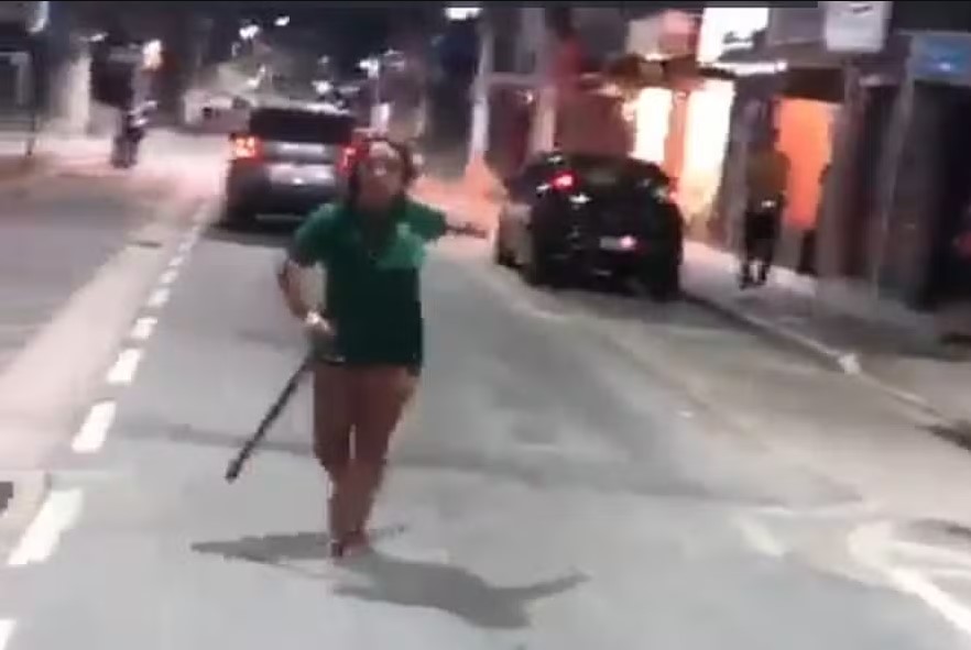De acordo com imagens que circulam nas redes sociais, a agressora aparece entrando e saindo tranquilamente de um posto policial segurando a barra de ferro utilizada no ataque, enquanto a vítima — visivelmente abalada — exibe hematomas no rosto e um dos olhos bastante inchado.