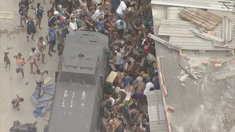 Uma carga roubada de carne foi saqueada por uma multidão, na tarde desta quarta-feira (6), no Complexo da Pedreira, em Costa Barros, Zona Norte do Rio. A Polícia Militar tentou intervir com um caveirão — veículo blindado da corporação — na frente dos moradores, que ignoraram os policiais e, em poucos minutos, levaram todos os alimentos.