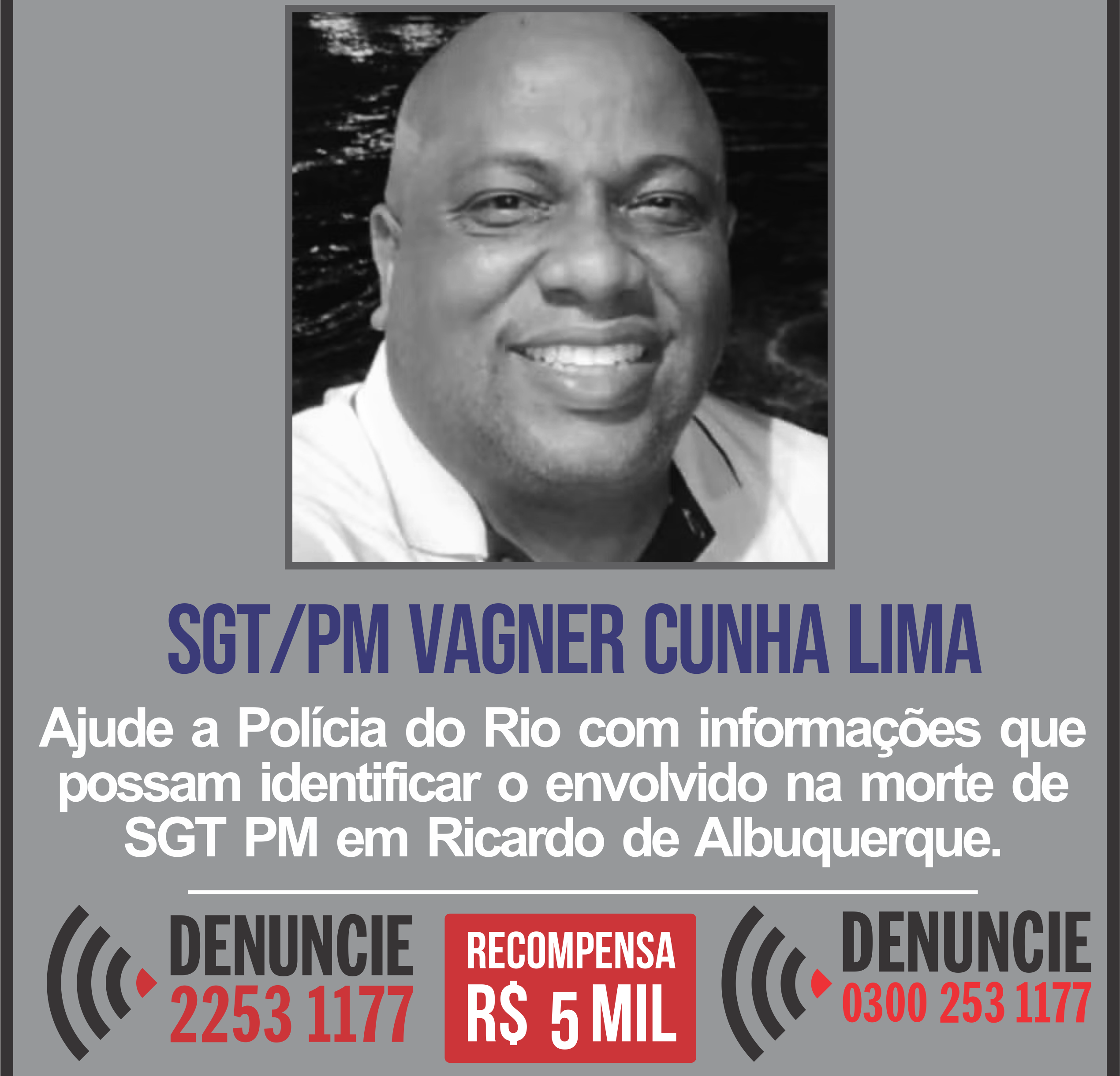 O Disque Denúncia divulgou, neste sábado (13), um cartaz com o título ‘Quem Matou?’ e uma recompensa de R$ 5 mil para auxiliar nas investigações da Delegacia de Homicídios da Capital (DHC) na identificação e prisão do assassino do sargento PM Vagner Cunha Lima, de 46 anos. Vagner estava de folga quando foi morto a tiros em um bar na Rua Pereira da Rocha, em Ricardo de Albuquerque, Zona Norte Rio. Ele é o segundo agente da corporação a morrer em menos de 5 dias.