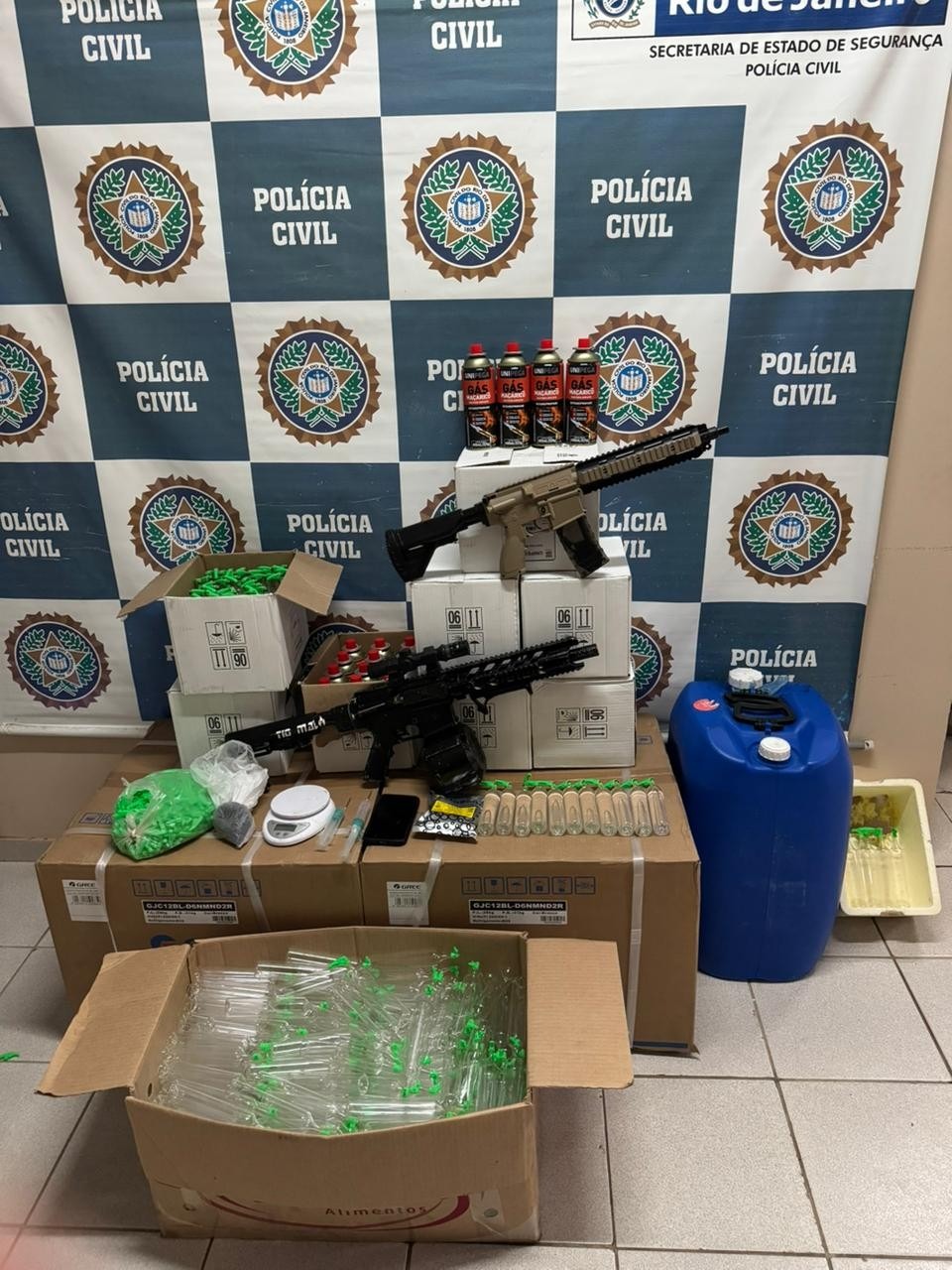 Durante a ação, os policiais apreenderam um galão com substância química, diversos frascos, seringas, tampas, elásticos, além de dois fuzis falsos e um celular que passará por perícia.