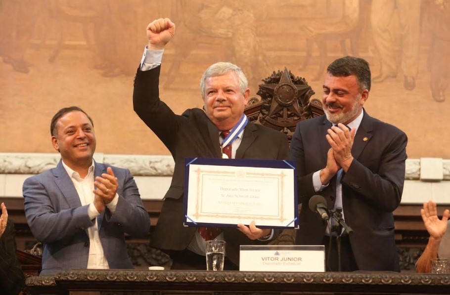 O prefeito de Niterói, Axel Grael, recebeu na noite desta quarta-feira (04) a Medalha Tiradentes, a maior honraria concedida pelo Poder Legislativo estadual. A homenagem foi entregue pelo deputado estadual Vitor Junior (PDT), em uma sessão solene realizada no Palácio Tiradentes, sede histórica do parlamento fluminense. O evento reuniu secretários municipais, lideranças políticas da cidade e do Estado, além da primeira-dama, Christa Vogel Grael.