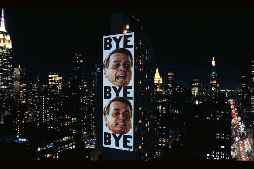Bye. Adiós. Adeus. Uma projeção de 76 metros de altura no centro de Manhattan, em Nova York, estampou na madrugada desta quinta-feira (27) imagens do presidente Jair Bolsonaro (PL) intercaladas pela palavra “adeus” em sete línguas diferentes.