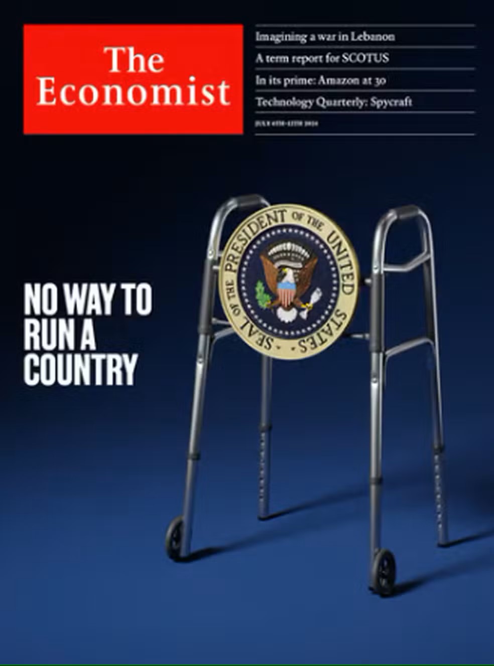 A capa da edição da revista publicada nesta quinta estampa a foto de um andador com o selo da presidência dos EUA e diz: “sem condição de comandar um país”. Biden tem 81 anos e, se reeleito, deixaria o segundo mandato com 86 anos.