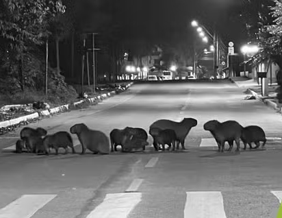 Um grupo de cerca de 20 capivaras, incluindo adultos e filhotes, atravessou a Rua Antônio Marques Mathias, na altura da Rua Miguel Arraes, no Loteamento Jardim Atlântico Oeste, interrompendo o tráfego.