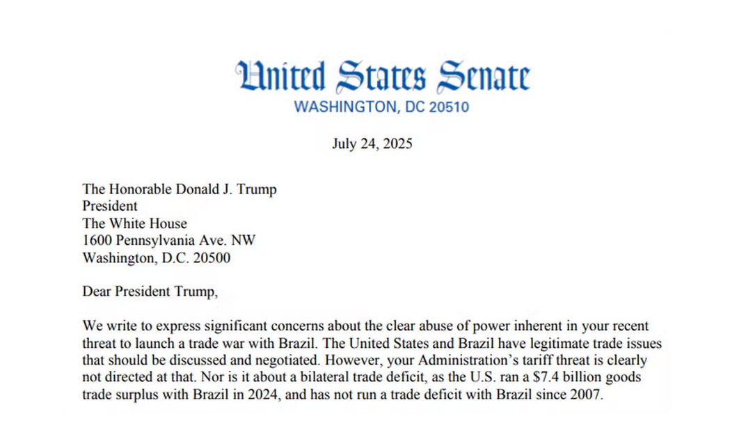 Escrevemos para expressar sérias preocupações sobre o claro abuso de poder presente em sua recente ameaça de iniciar uma guerra comercial com o Brasil. Os Estados Unidos e o Brasil têm questões comerciais legítimas que devem ser discutidas e negociadas. No entanto, a ameaça de tarifas feita por sua administração claramente não se refere a isso. Tampouco se trata de um déficit comercial bilateral, já que os EUA tiveram um superávit de US$ 7,4 bilhões em bens com o Brasil em 2024 e não registram déficit comercial com o país desde 2007.
