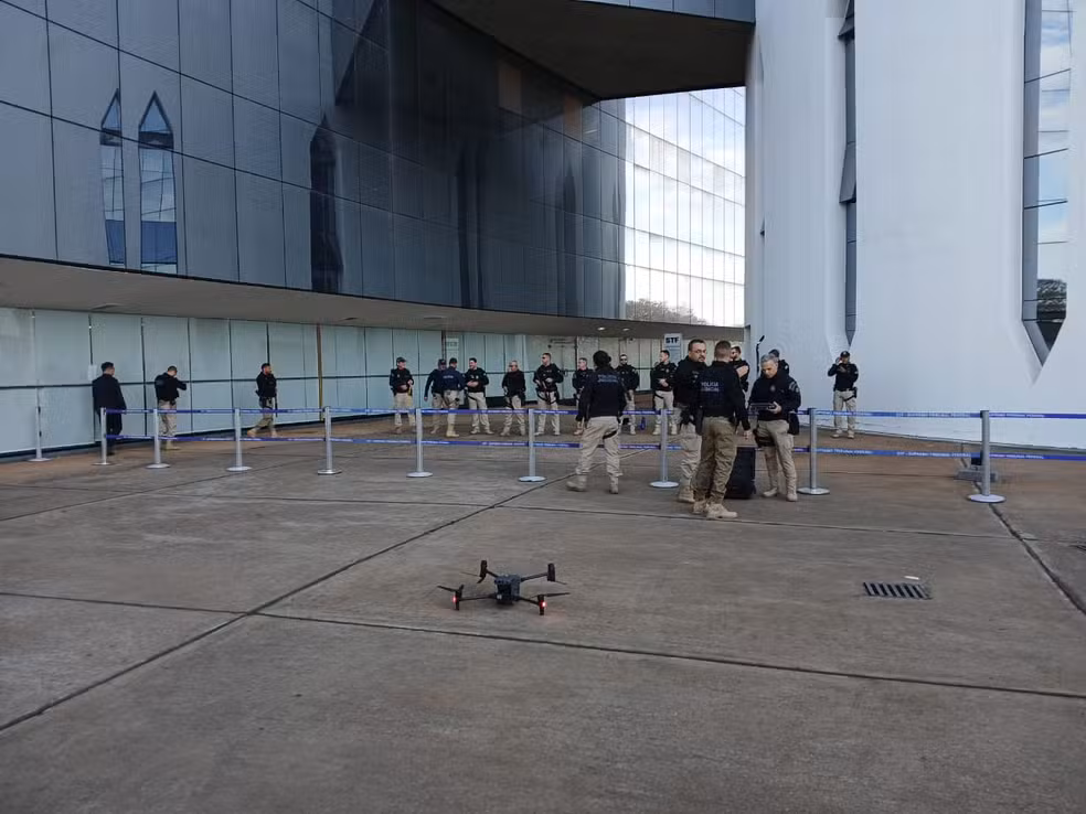 A Polícia Judicial realizou uma varredura preventiva com cães farejadores no entorno do Supremo Tribunal Federal (STF). O reforço na vigilância visa garantir a tranquilidade da sessão, marcada para começar às 9h.