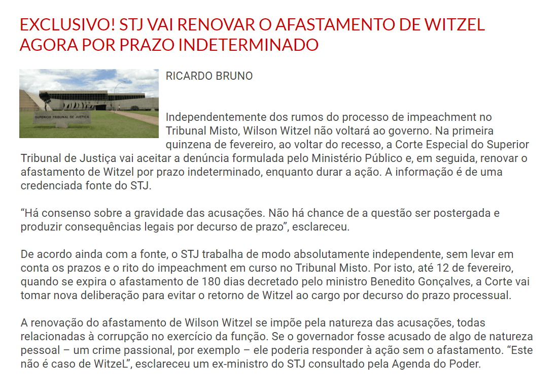 Como antecipou a Agenda do Poder, em 13 de janeiro, a Corte Especial do Superior Tribunal de Justiça (STJ) aceitou, nesta quinta-feira (11/02) por unanimidade a denúncia por corrupção e lavagem de dinheiro contra o governador afastado do Rio de Janeiro Wilson Witzel. Com isso, ele passa à condição de réu. O STJ também determinou que ele fique mais um ano afastado do cargo, e manteve medidas cautelares, como a proibição de manter contato com outros investigados.