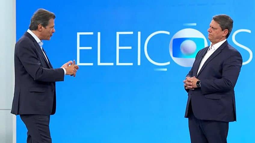 Os candidatos ao governo de São Paulo, Fernando Haddad (PT) e Tarcísio de Freitas (Republicanos), enfrentaram-se à noite passada em debate na TV Globo trocando acusações que envolveram os candidatos à Presidência da República, seus padrinhos Lula e Bolsonaro. Discutiram, em vez de temas estaduais, a valorização do salário-mínimo, vacinação, agronegócio, transferência de renda e outras questões de âmbito nacional, segundo relatos publicados pelo Estadão e a Folha. Temas estaduais até apareceram, mas em segundo plano.