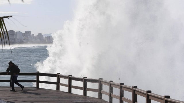 A Marinha do Brasil emitiu alerta de ressaca, válido até as 21h desta sexta-feira (20), devido às fortes ondas que podem chegar a quatro metros na cidade do Rio de Janeiro. Na Praia do Leblon, Zona Sul, as ondas gigantes chegaram até o mirante, onde turistas e cariocas admiravam o fenômeno, mesmo sob risco alertado pelas autoridades.