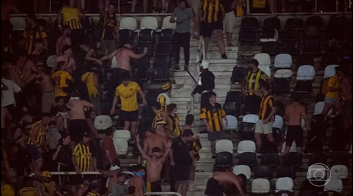 Imagens da câmera exclusiva da TV Globo na transmissão da partida mostraram o momento em que um torcedor do Peñarol arremessa uma cadeira em direção a agentes que trabalhavam na segurança da partida. Na sequência, um policial o golpeia com um cassetete, e outros integrantes da torcida tentam defendê-lo.