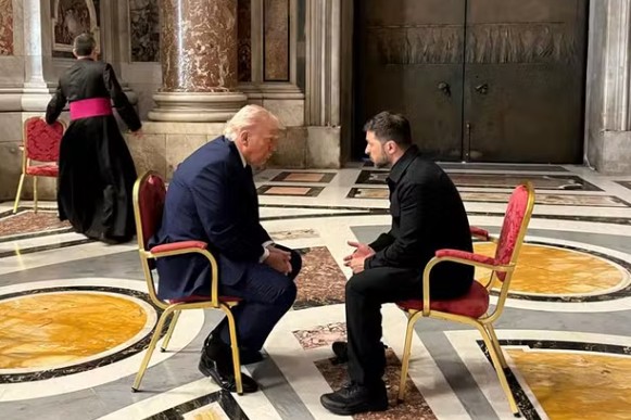 O presidente dos Estados Unidos, Donald Trump, e o presidente da Ucrânia, Volodymyr Zelensky, realizaram uma breve reunião neste sábado (26) no Vaticano, momentos antes do funeral do Papa Francisco. De acordo com informações da agência AFP, os dois líderes conversaram por cerca de 15 minutos dentro da Basílica de São Pedro e acertaram um novo encontro para o próximo sábado.