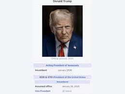 O presidente dos Estados Unidos, Donald Trump, publicou neste domingo (11) uma imagem em que aparece como “Acting President of Venezuela” — ou presidente interino da Venezuela — na plataforma Truth Social. A montagem foi criada com base em uma versão editada de uma página de Wikipedia e rapidamente viralizou nas redes sociais.