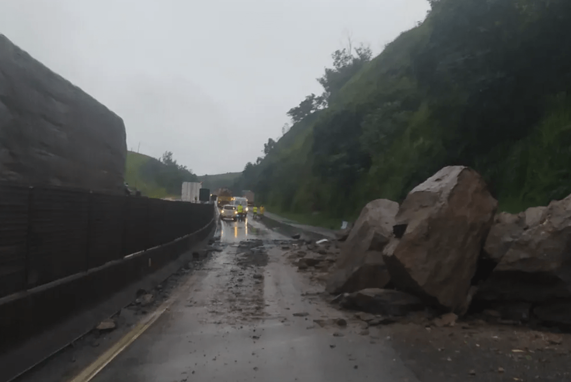 Segundo a Polícia Rodoviária Federal, pedras da encosta da pista deslizaram em decorrência da chuva e chegaram a atingir uma carreta. O motorista não ficou ferido.