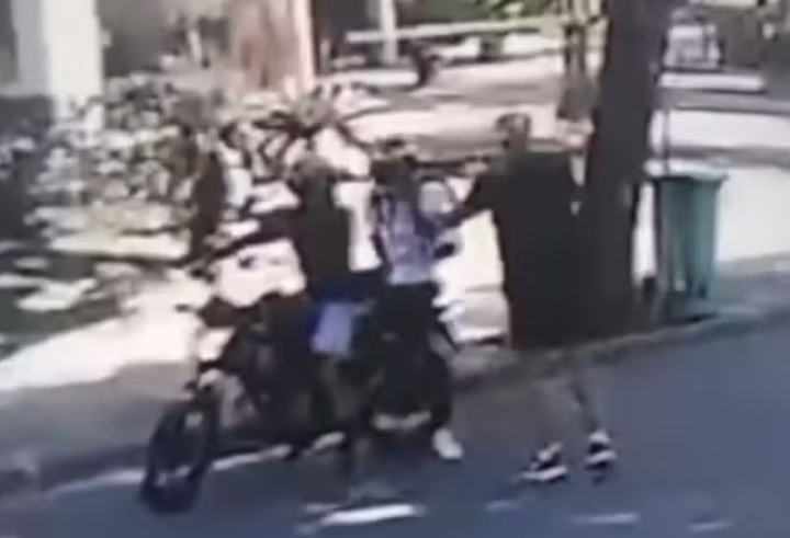 As imagens mostram um homem de camisa preta caminhando tranquilamente por uma das ruas internas do condomínio enquanto fala ao celular. Em questão de segundos, dois homens de moto se aproximam: o garupa desce rapidamente e aborda a vítima com um gesto que simula estar armado, apontando para a cintura.