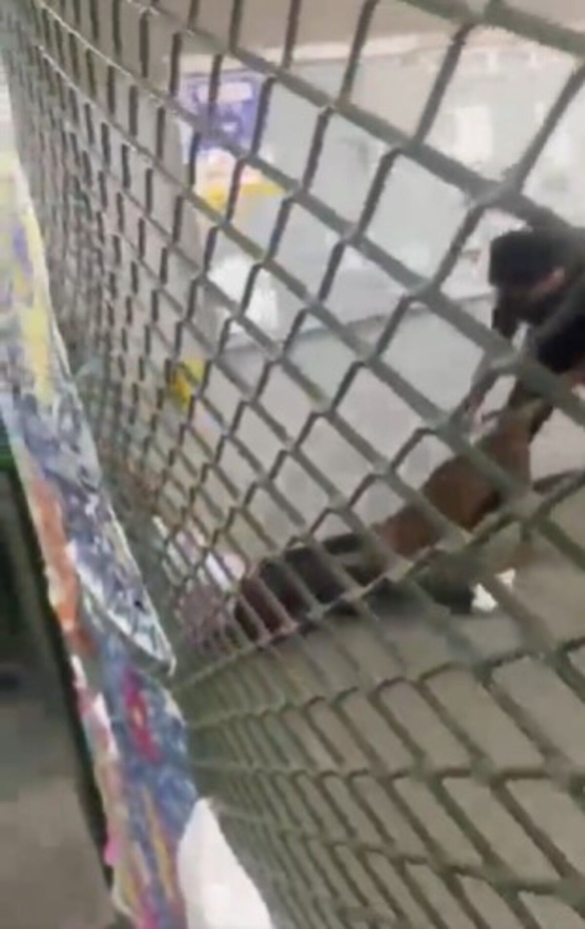 Imagens que circulam nas redes sociais mostram o momento em que o pitbull é afastado do local.